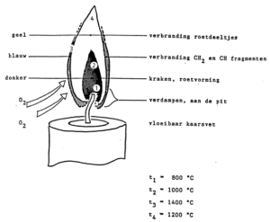 Hoe het verbrandingsproces verloopt, is goed te beschrijven aan de hand van een kaarsvlam (zie figuur 1). Circa 4 à 5% van de ontwikkelde warmte straalt terug naar de kaars. Daardoor smelt een deel van het kaarsvet en wordt capillair opgezogen via de pit. Boven in de pit verdampt het kaarsvet en gaan de moleculen steeds sneller bewegen door de energietoevoer. In de reactiezone diffundeert zuurstof naar binnen en worden de kaarsvetmoleculen gekraakt.