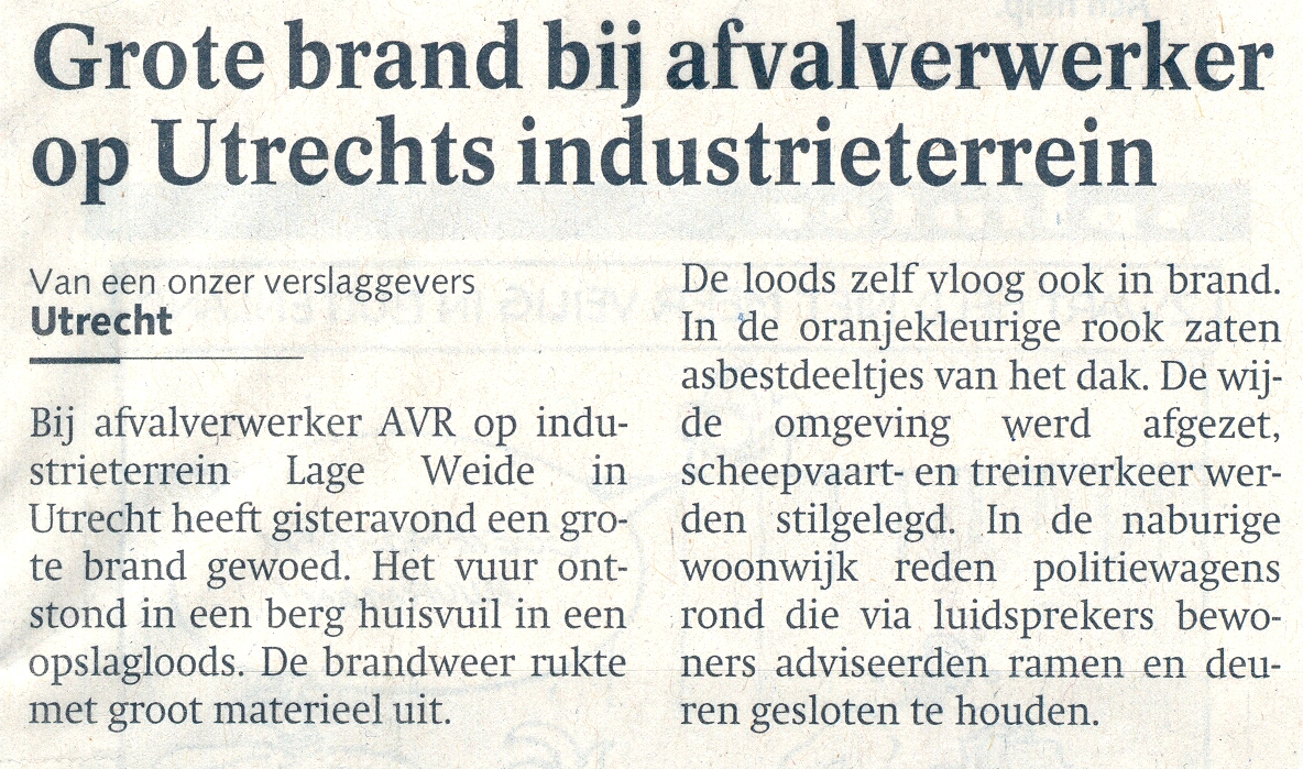 figuur 1. bovenstaand krantenartikel bewijst weer eens dat brand een moeilijk te beheersen fenomeen is; de consequenties voor de omgeving van de inrichting waar de brand woedde waren in dit geval groot (juni 2003)