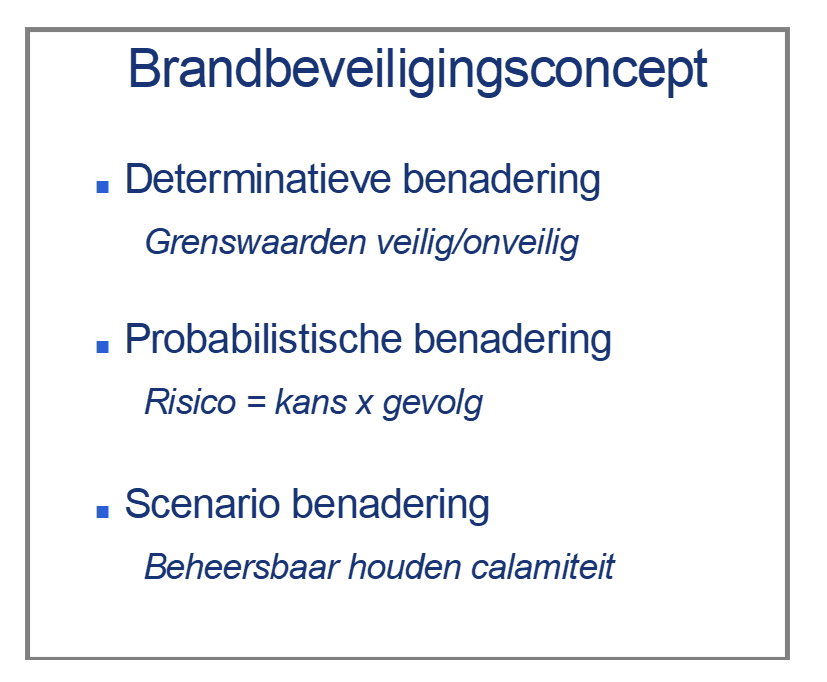 figuur 6. de drie benaderingen die in een brandbeveiligingsconcept een rol spelen; vooral de probabilistische benadering en de scenario-benadering spelen hierin een rol