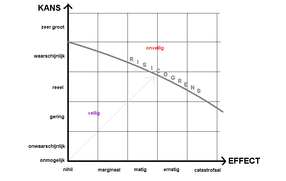 De bovenstaande relatie is in de matrix van figuur 2 grafisch weergegeven. In een dergelijke matrix kan ook het toelaatbare risico (risicogrens) worden weergegeven. Dit hoeft niet persé een lineaire relatie te zijn.