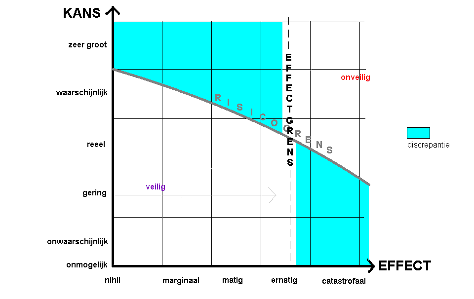 Wanneer de kans op het optreden van het incident relatief groot is moet het effect daarvan juist klein zijn om het toelaatbare risico niet te overschrijden. Omgekeerd kan bij een kleine kans juist een groot effect worden toegestaan. Veiligheidseffecten worden doorgaans uitgedrukt in lethale slachtoffers, schade-effecten in kosten.